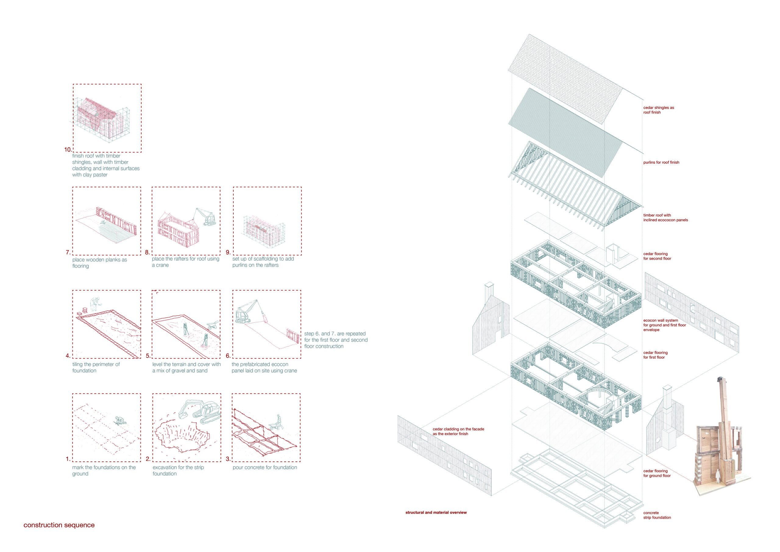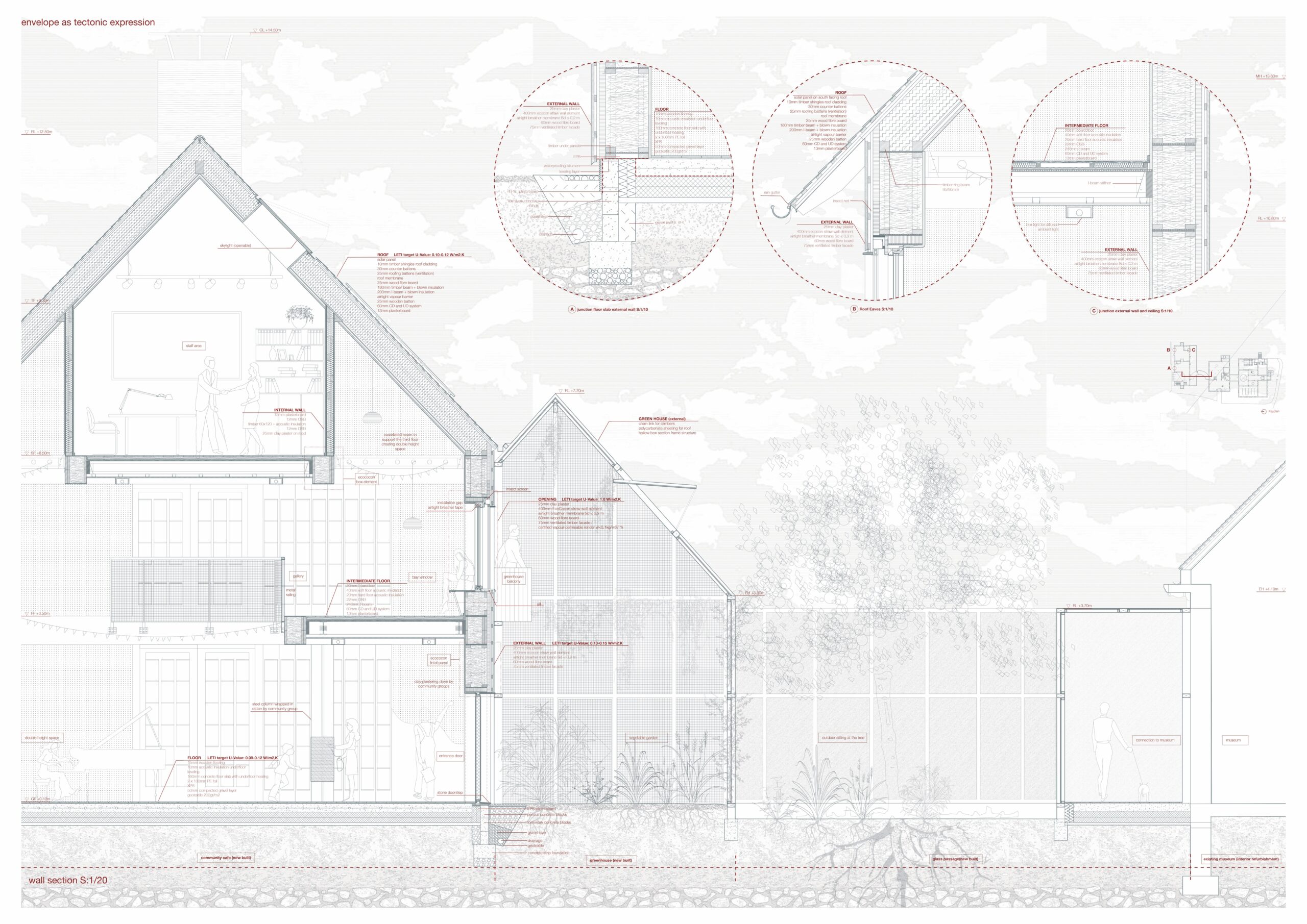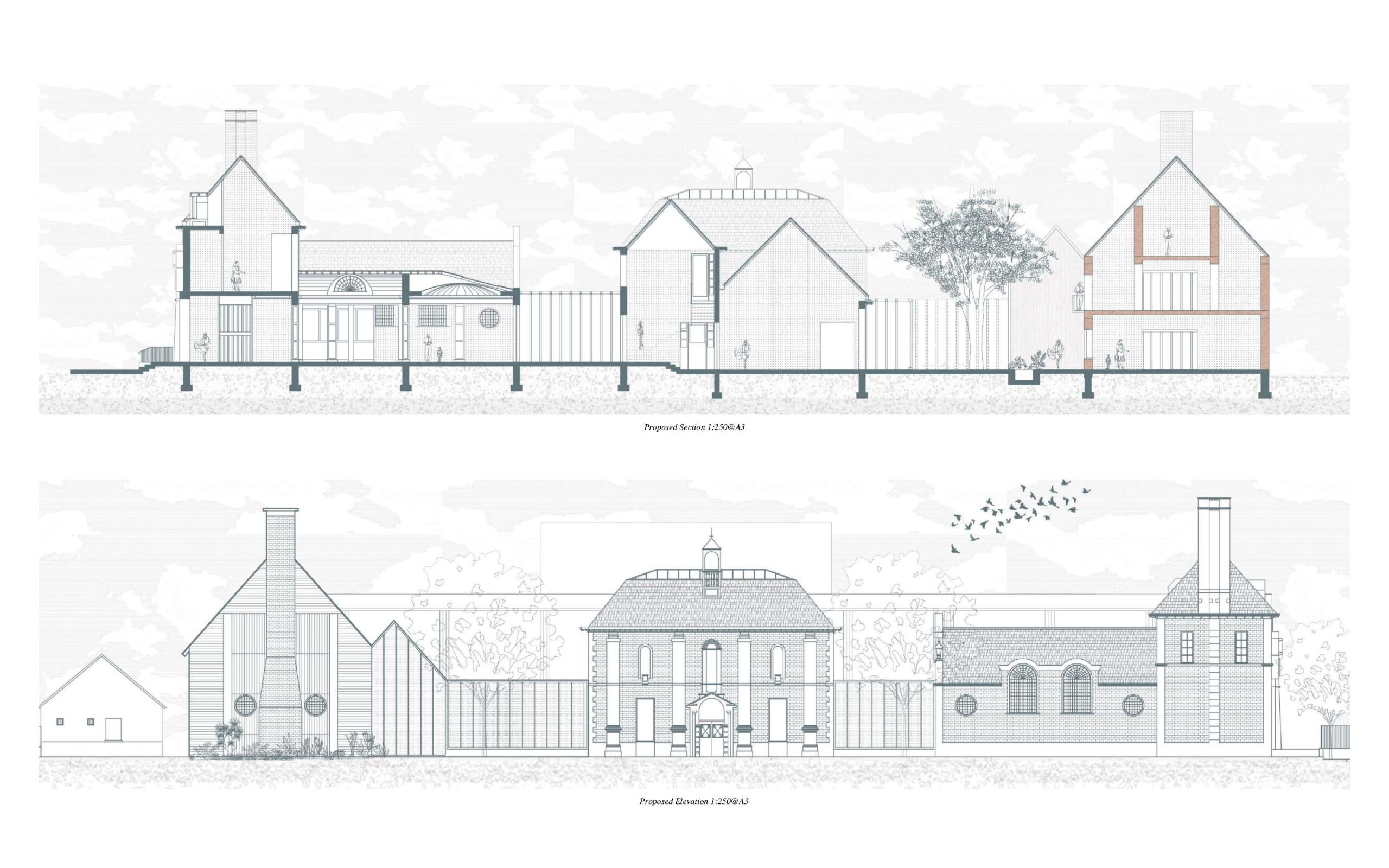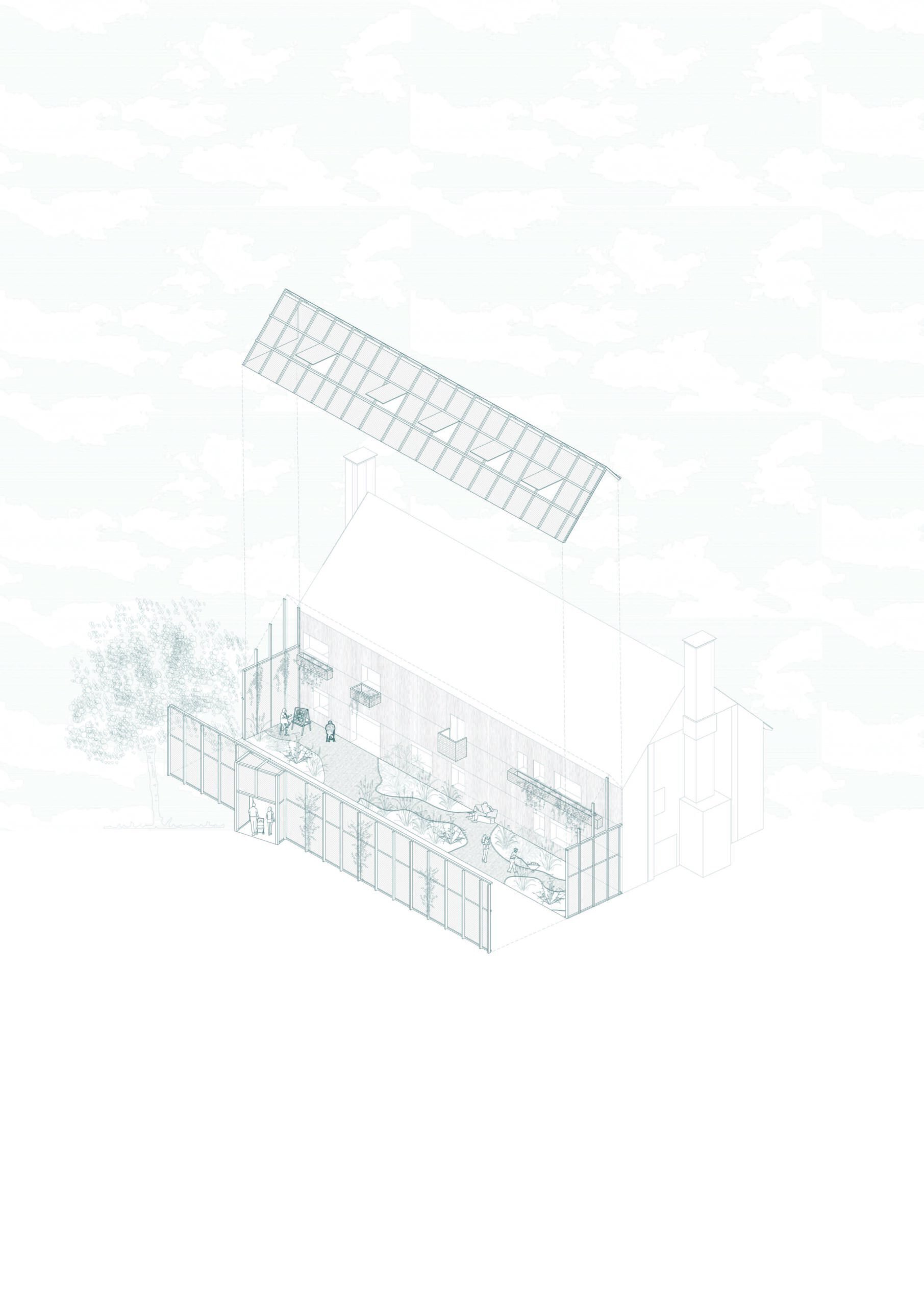 Her proposal revolves around community engagement through cooking, inspired by the Forest School. A pizza oven symbolizes fire in the town centre, while a greenhouse and exhibition space extends from the existing museum and library.