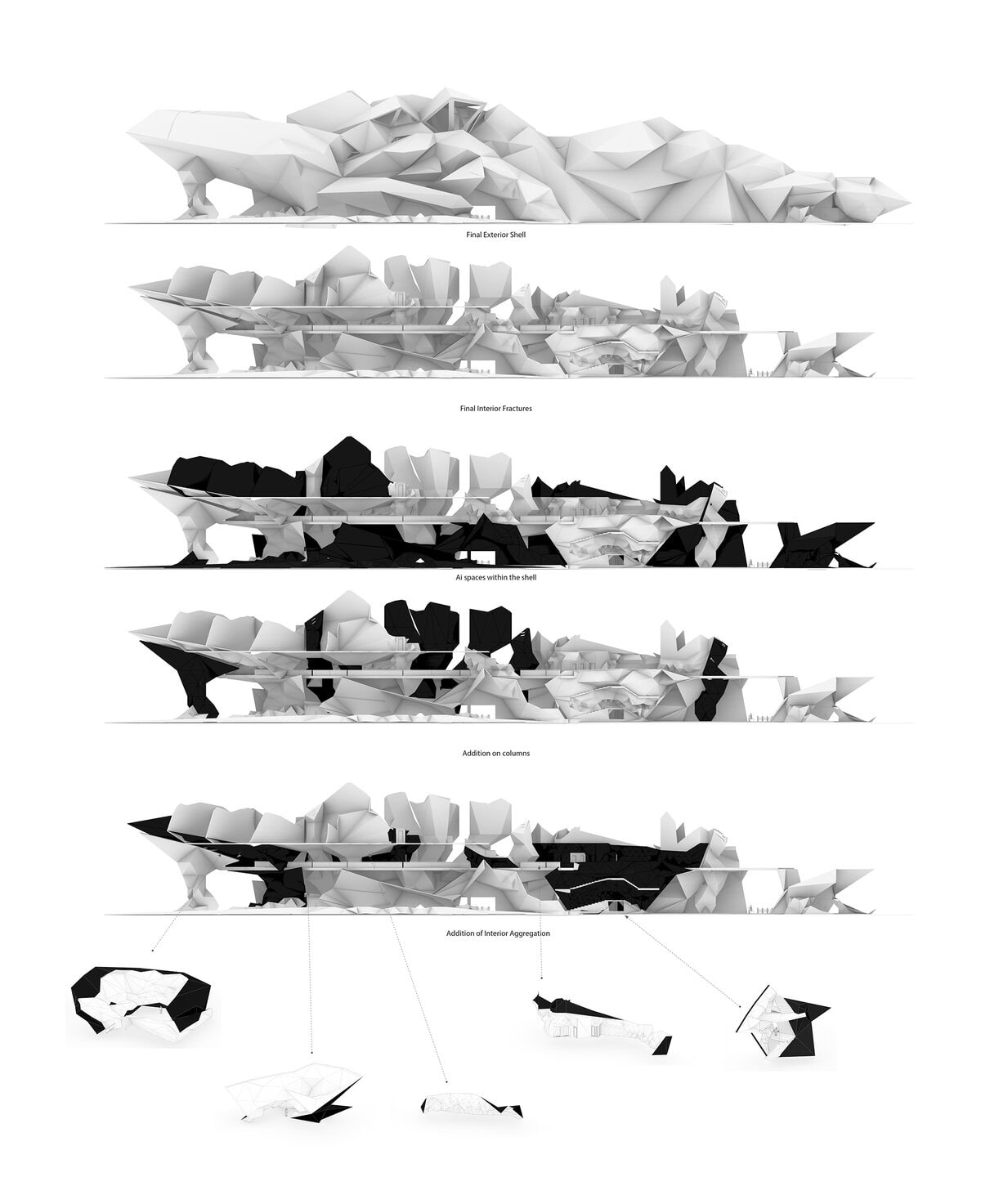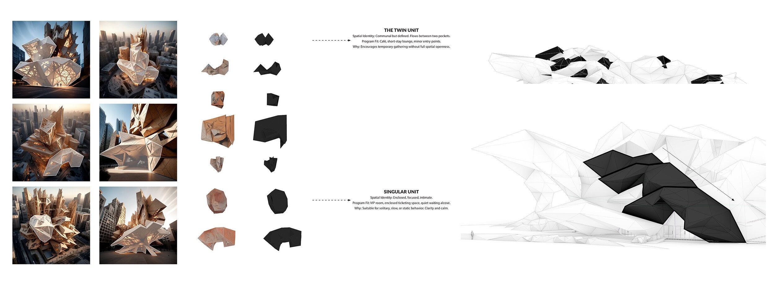 The architecture emerges through AI-generated provocations, where physical and digital models were used as input to guide the creation of unfamiliar yet intuitive forms. These forms were then decoded and reassembled to shape the spatial system of the terminal. The result is a fractured path composed of prefabricated, interlocking units that gradually shift in direction, transparency, and height—producing a dynamic spatial rhythm that responds to both users and context.