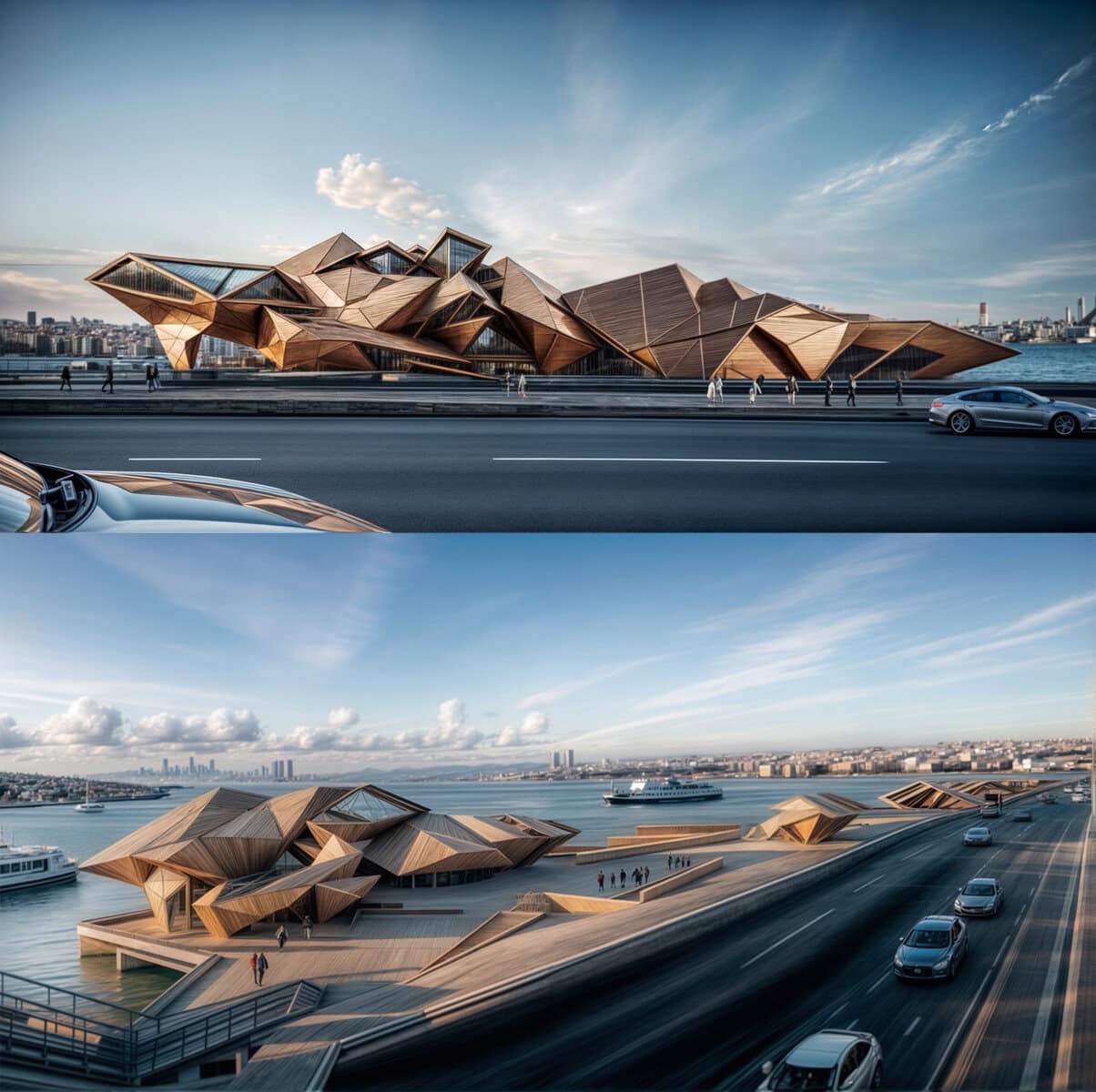 “Fold Me a Path: An Experience of Fractured Flow” is Farah Swilam’s final thesis project, a prefabricated ferry terminal designed for the waterfront of Istanbul’s Golden Horn. The project investigates how artificial intelligence can serve as a co-designer in shaping new architectural languages rooted in human behavior and perception. Through a process of iterative AI prompting and form extraction, the project reinterprets fragmented geometries and modular growth—drawing inspiration from crystallography, Islamic pattern logic, and movement studies.