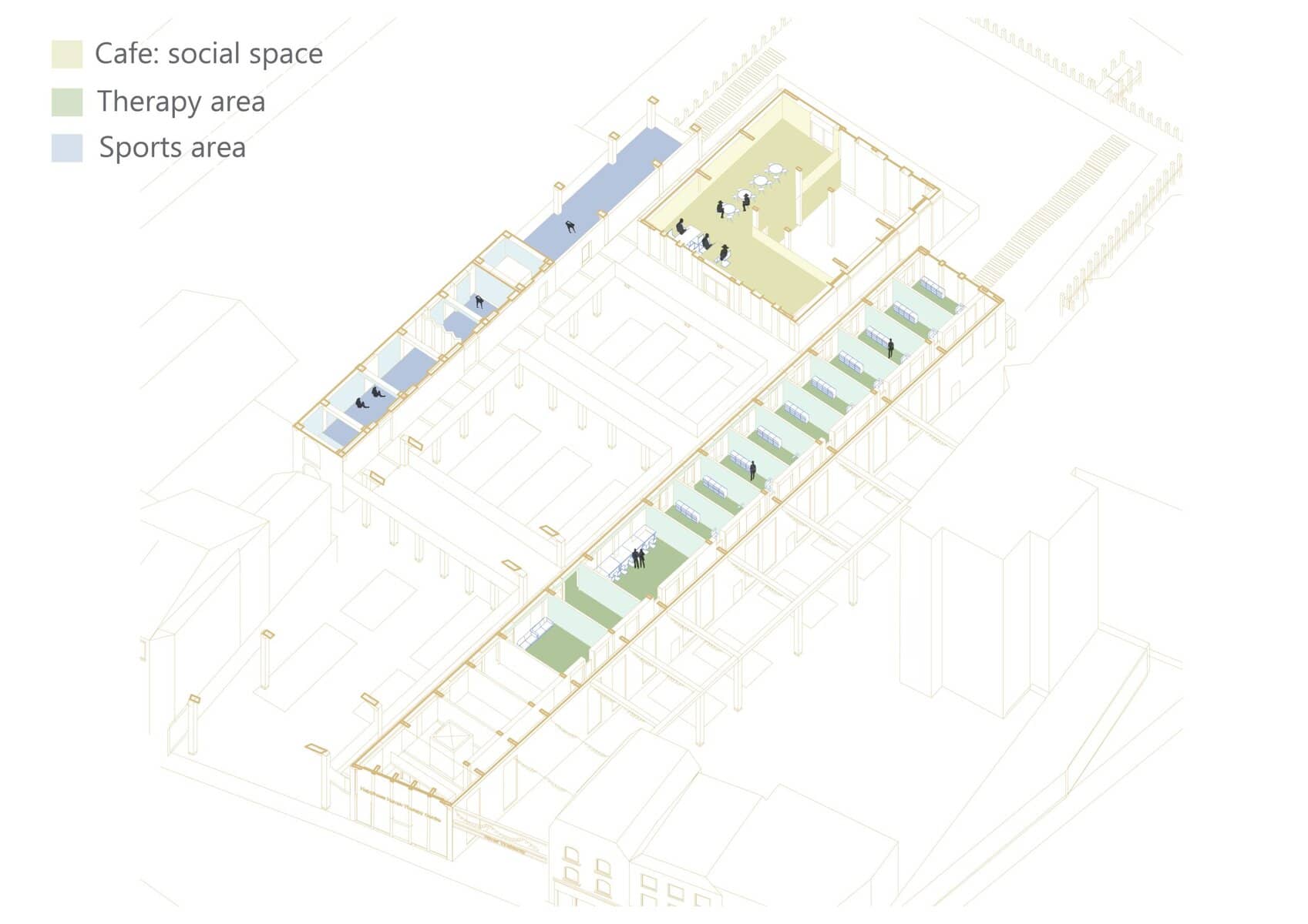 Located at the heart of the building, a therapy centre offers a haven for individuals seeking mental wellness. The centre provides a diverse range of therapies, including traditional group therapy and innovative approaches like nature and sports therapy.