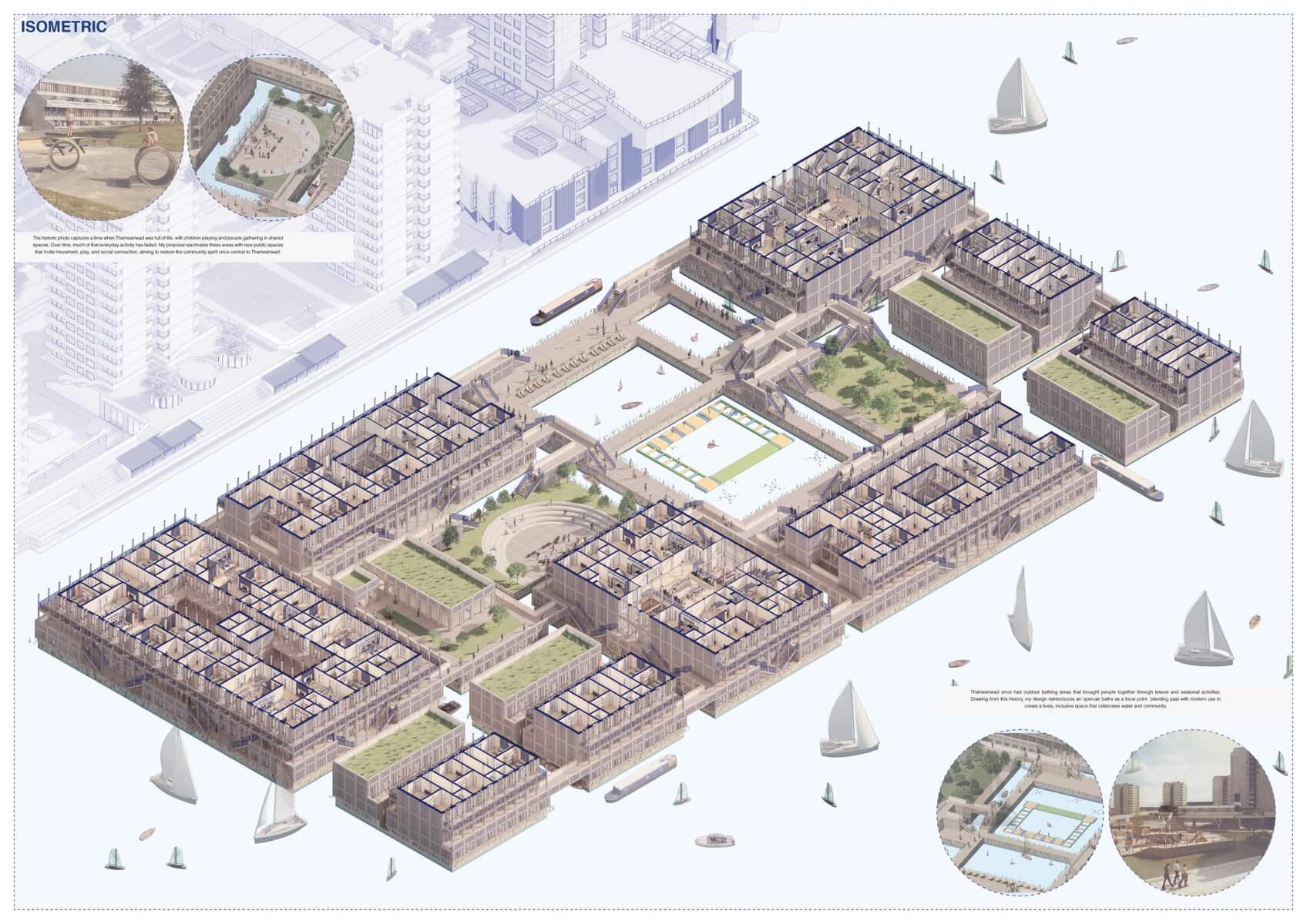 His thesis project explores floating housing as a resilient solution to London's growing housing crisis and flood risks. Based in Thamesmead, a low-lying area vulnerable to rising water levels, the project combines flood-resilient architecture with sustainable urban planning. It responds to alarming climate projections indicating that by the 2080s, flooding in London could become significantly more frequent and severe, threatening over 1.25 million people and critical infrastructure such as hospitals, schools, power stations, and the Underground network.