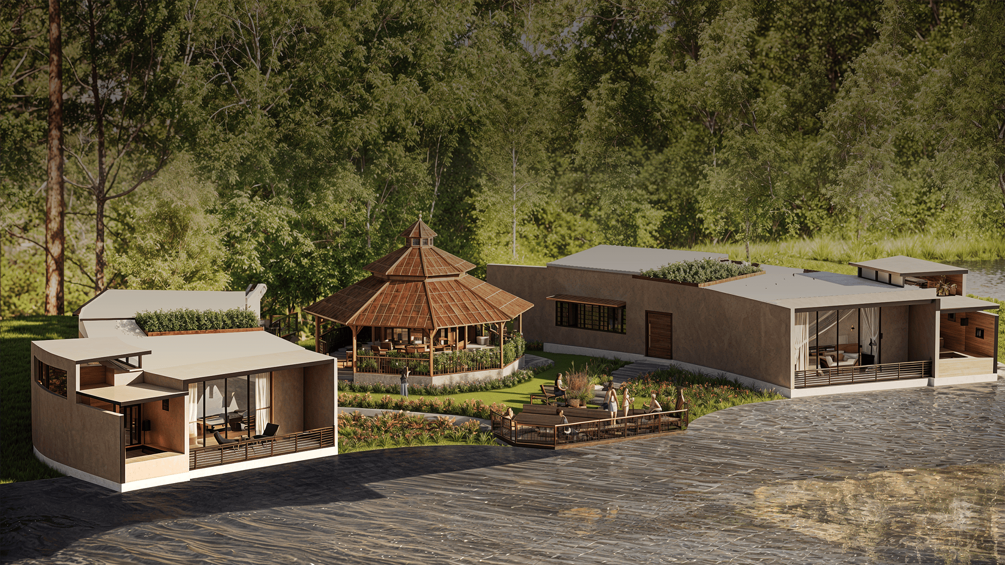 "Neerāngāna" is Hammad's resort design developed during his 4th semester, envisioned as a serene escape rooted in cultural richness and natural harmony. The architecture synthesizes vernacular knowledge and modern comfort, with the goal of building a tranquil, earthy environment in which nature and culture are quietly served by architecture. Employing climate-sensitive measures, it redefines conventional features such as courtyards, jali screens, and mud walls in a manner that is thoroughly up to date but indigenous in spirit. Materials sourced locally compressed mud, bamboo, and thatch confer on the structures a living, breathably natural quality while minimizing environmental footprint. The villas are designed to flow along the curves of the terrain, with each unit having private lake frontage and a strong bond with nature.