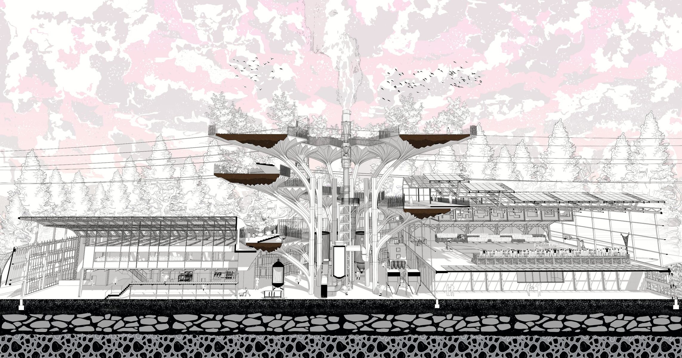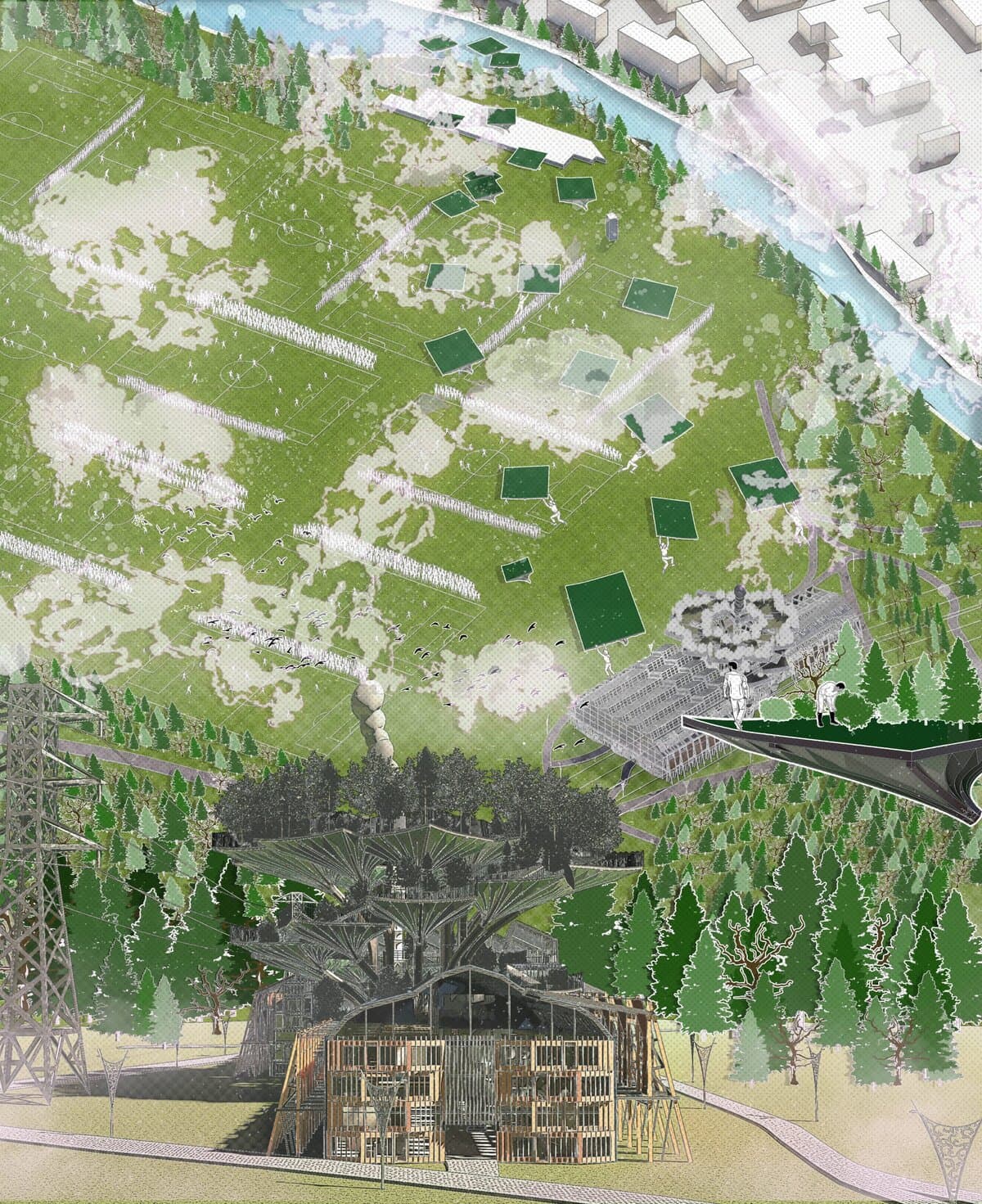 PowerPlay is a speculative civic proposition that fuses community sport, renewable energy production, and ecological learning into a single regenerative system. Framed around a district-scale biomass cogeneration plant and a kinetic sports infrastructure set in the capital of English Sunday League Football, the project explores how architectural typologies can serve as living systems — metabolising energy, waste, and social movement into a continuous urban loop.