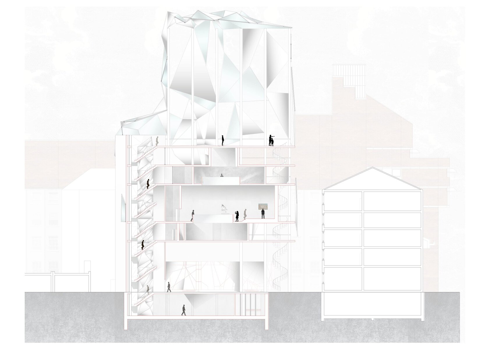 Veronia Abelshehid’s final-year project, The Citizen’s Hyperbook Market and Theatre, reimagines the relationship between literature, architecture, and public engagement by creating a cultural nexus for community interaction and creative expression. Sited within the courtyard of the Levita House in King’s Cross, London, the project emerges as both a critique and a response to the nearby King’s Library Tower at the British Library, challenging hierarchical models of knowledge and proposing instead an open framework where citizens become co-authors of literary culture.