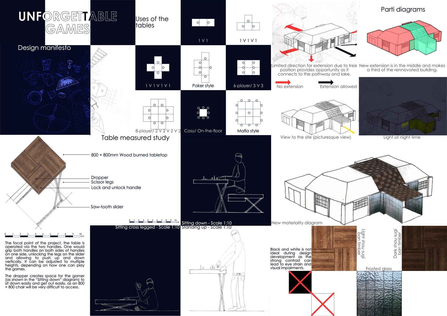 UnforgetTABLE Games is the third Integrated Design Project (IDP) of Year 1, where it focuses on re-purposing an unused building, amending it to give it new life and creating an extension from the building to the surroundings. The IDP 3 project serves as preparation for Year 2 where it teaches students on the importance of "killer drawings" and final-review presentation suited for industry-level architecture proposals and competitions.
